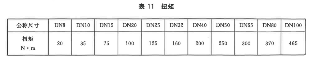 閥門應(yīng)能承受的扭矩按表11的規(guī)定,按規(guī)定進(jìn)行抗扭性能試驗(yàn)后,應(yīng)無破損、變形,且殼體強(qiáng)度和.密封性能應(yīng)符合規(guī)定。