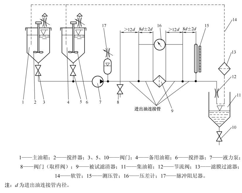 3 在整個(gè)試驗(yàn)過(guò)程中, 應(yīng)小心控制裝有試驗(yàn)液的主油箱攪拌器的轉(zhuǎn)速, 以防止空氣進(jìn)入。 當(dāng)壓差計(jì)(16) 的靜壓差達(dá) 70 kPa 時(shí), 關(guān)閉液力泵(7) 和主油箱(1) 下面的出口閥門(3) , 并記錄計(jì)時(shí)器上的累計(jì)時(shí)間。