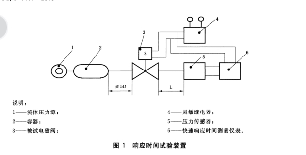 電磁閥人口側通以制造商規(guī)定的最大液體壓力,將額定電壓的通斷信號接人被測電磁閥控制電磁閥開閉,用壓力傳感器測量電磁閥出口側的壓力變化,并同時用快速響應時間測量儀表測量從電壓通斷瞬間開始到壓力上升到最大值的90%(對常閉電磁閥而言)或壓力下降到最大值的10%(對常開電磁閥而言)的間隔時間,以重復試驗三次取其算術平均值分別作為開啟時間或關閉時間,結果應符合要求。