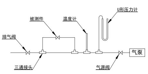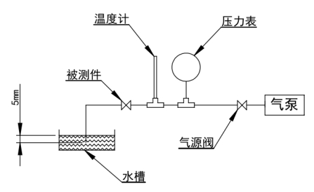 應(yīng)使用下圖所示裝置或同等以上精度等級(jí)的試驗(yàn)裝置進(jìn)行閥體氣密性試驗(yàn)。