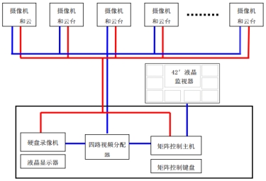 4.電視墻為4個(gè)19英寸顯示器組合而成,包括液晶監(jiān)視器、矩陣切換/控制主機(jī)、矩陣控制鍵盤(pán)、視頻分配器、畫(huà)面分割器等。