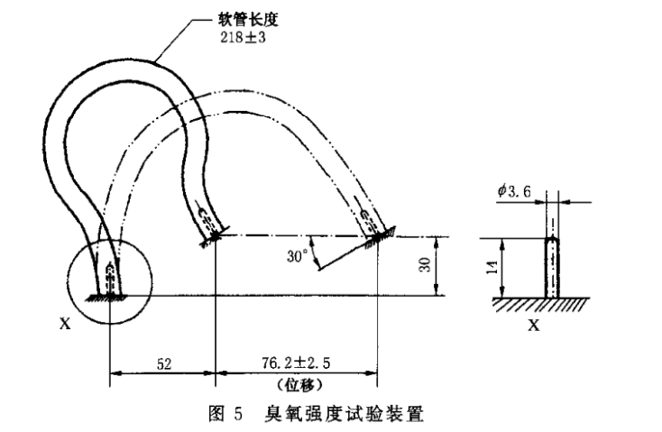 將軟管組合件裝配到動態(tài)臭氧試驗機上,并應(yīng)滿足圖5所示的相應(yīng)位置和屈撓參數(shù)。將長度為218 mm士3 mm的軟管組合件插人臭氧試驗裝置上定位銷,直至軟管組合件接觸到定位銷底部時為止,用帶箍將軟管組合件牢固地固定在定位銷上。